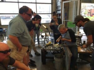In this beginning course to glass blowing, students will learn the basics of manipulating hot glass. Each week during the four-week course, we will work on specific criteria to help you reach your full potential in glass. We will build a foundation that focuses on a team approach to glass blowing, with an emphasis on safety, proper tool use, basic techniques, and materials. Students will learn the appropriate movements and manipulation of glass in the hot shop while reaching the goals of making a straight walled tumbler/cylinder.