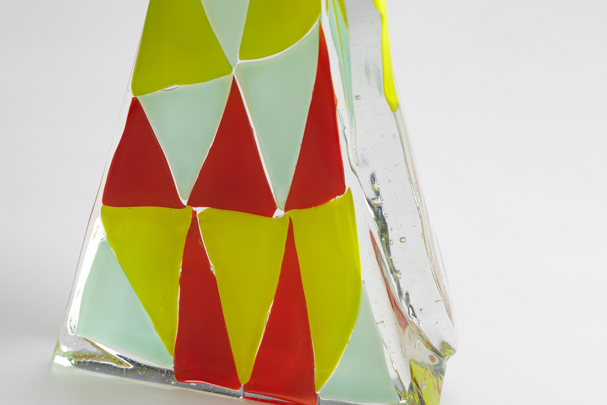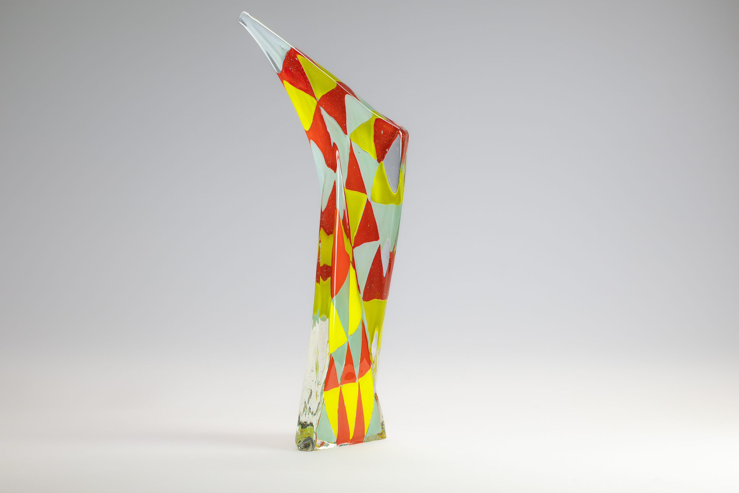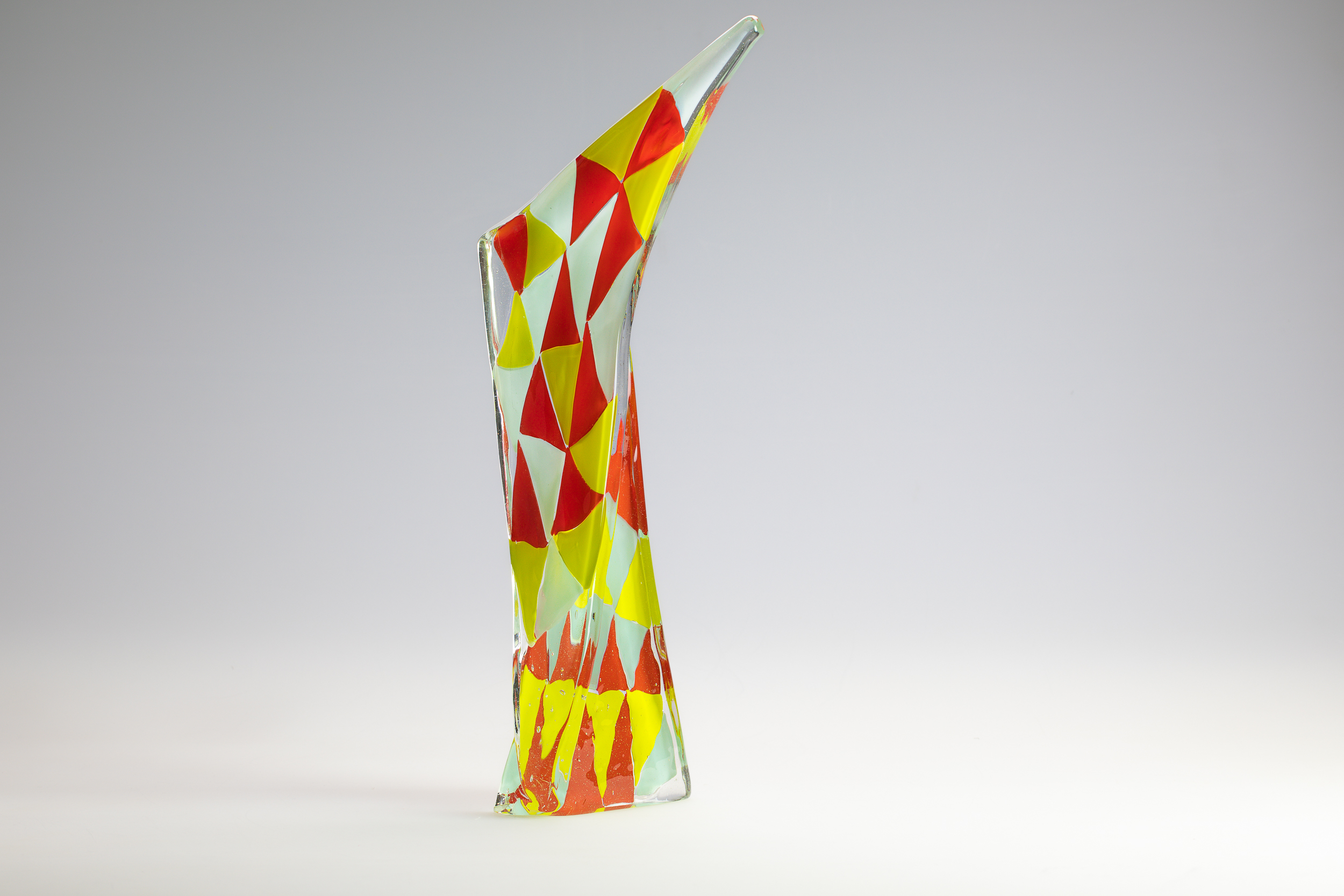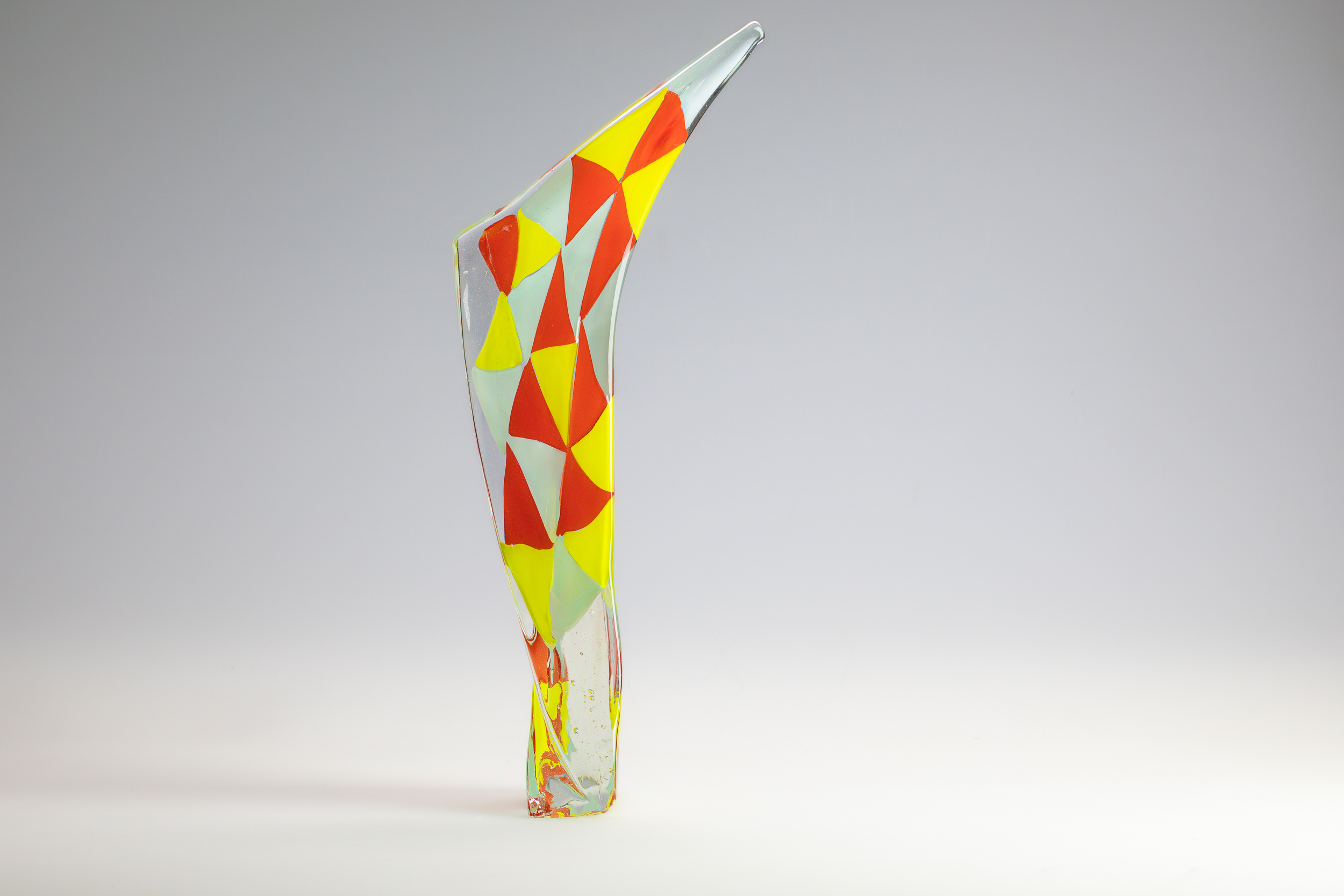 Holliday’s practice typically centers on kiln-cast glass and monochromatic depth, but this series embraced spontaneity and play. By incorporating color and pattern into geometric forms, he created a synthesis of structure and fluidity. The red and yellow shapes woven into the glass evoke rhythm and tension, while the polished surface enhances the material’s ability to carry light and atmosphere. The sculpture stands tall and slender, its dynamic silhouette punctuated by bold geometric patterns. Red and yellow elements dance across the surface, creating a sense of motion within the rigid form. It’s a piece that feels both grounded and expressive—an architectural gesture infused with joy.
