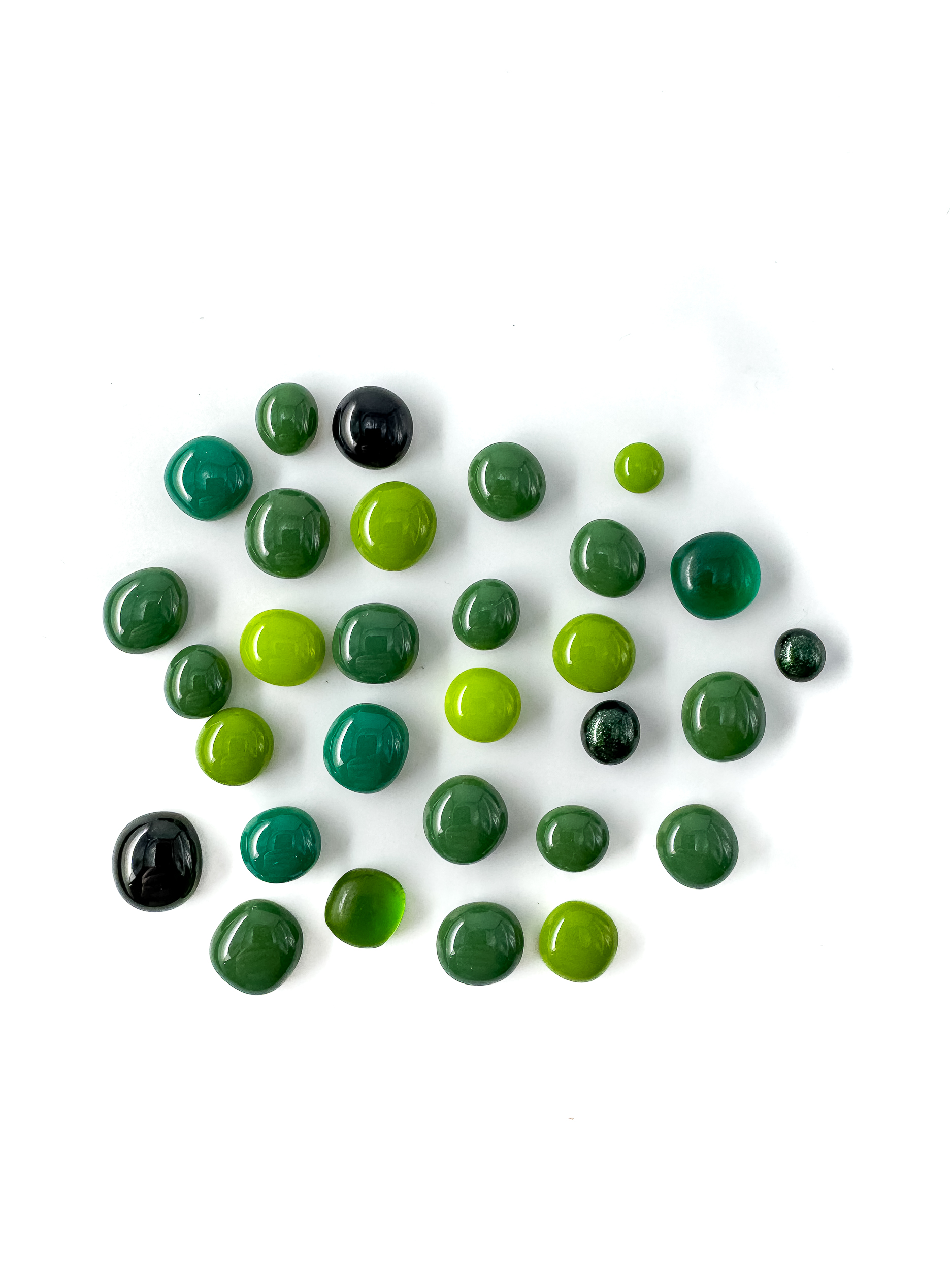 Each pebble is formed from Bullseye (90 COE) glass and fully fused for a polished finish. Sold by the ounce, pebbles vary slightly in size and shape, averaging around 10mm in diameter and approximately 6mm thick — the natural result of standard 3mm sheet glass melting in the kiln.