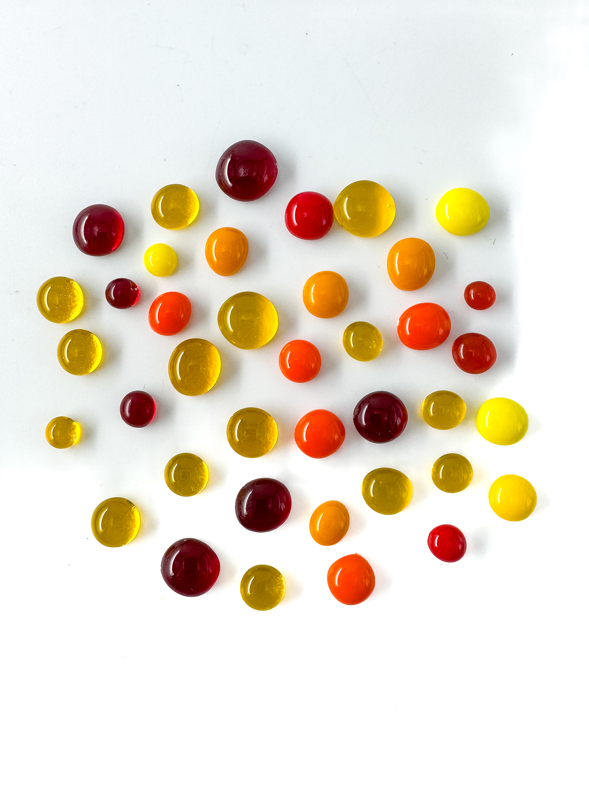 Each pebble is formed from Bullseye (90 COE) glass and fully fused for a polished finish. Sold by the ounce, pebbles vary slightly in size and shape, averaging around 10mm in diameter and approximately 6mm thick — the natural result of standard 3mm sheet glass melting in the kiln.